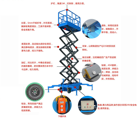 升降平台车主要用于载人高空作业的检修、维护、更换物件、保养、清洁、布景等。适用场所:工厂、矿场、市政管理、树木检修、电气线路、铁路、公路、机场、邮电、石油、电力、大厅、宾馆、会堂装饰、化工、医药、航天、部队、核电、摄影、消防、体育馆、小区物业、建筑布置、配套清洗公司等。